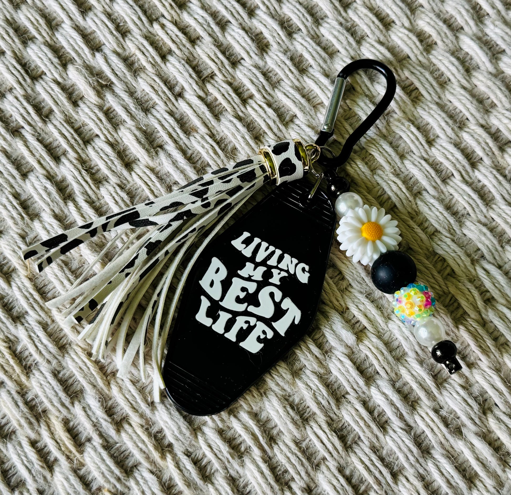 Each adorable motel tag comes on a carabiner along with a tassel and beaded daisy keychain to match. These little quotes can really help you through a tough day. Perfect for your keys or bags!